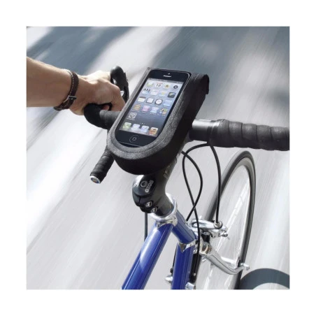 Le PhoneBag est rapidement et fermement fixé sur le vélo via le système KLICKfix Quad et peut être détaché d’un seul geste en appuyant sur un des deux boutons de déverrouillage. La sangle en inox souple permet de fixer l’attache sur n’importe quel potence, cintre ou cadre.